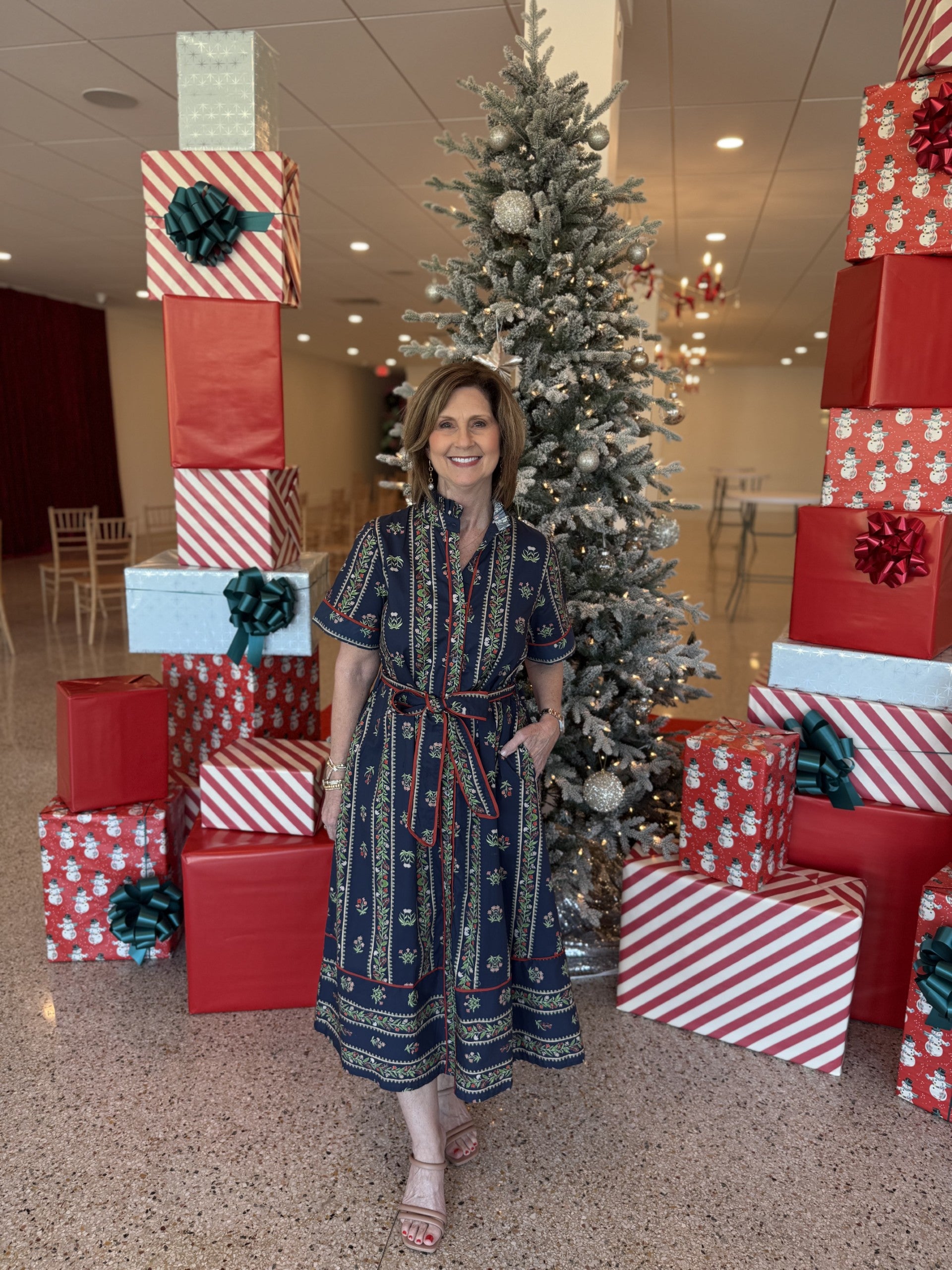 Step into the season with effortless elegance in our Noelle Dress—a timeless midi designed to make every holiday moment feel special. Featuring a rich navy base adorned with festive-inspired detailing, this flattering silhouette ties at the waist for a perfect, feminine fit.