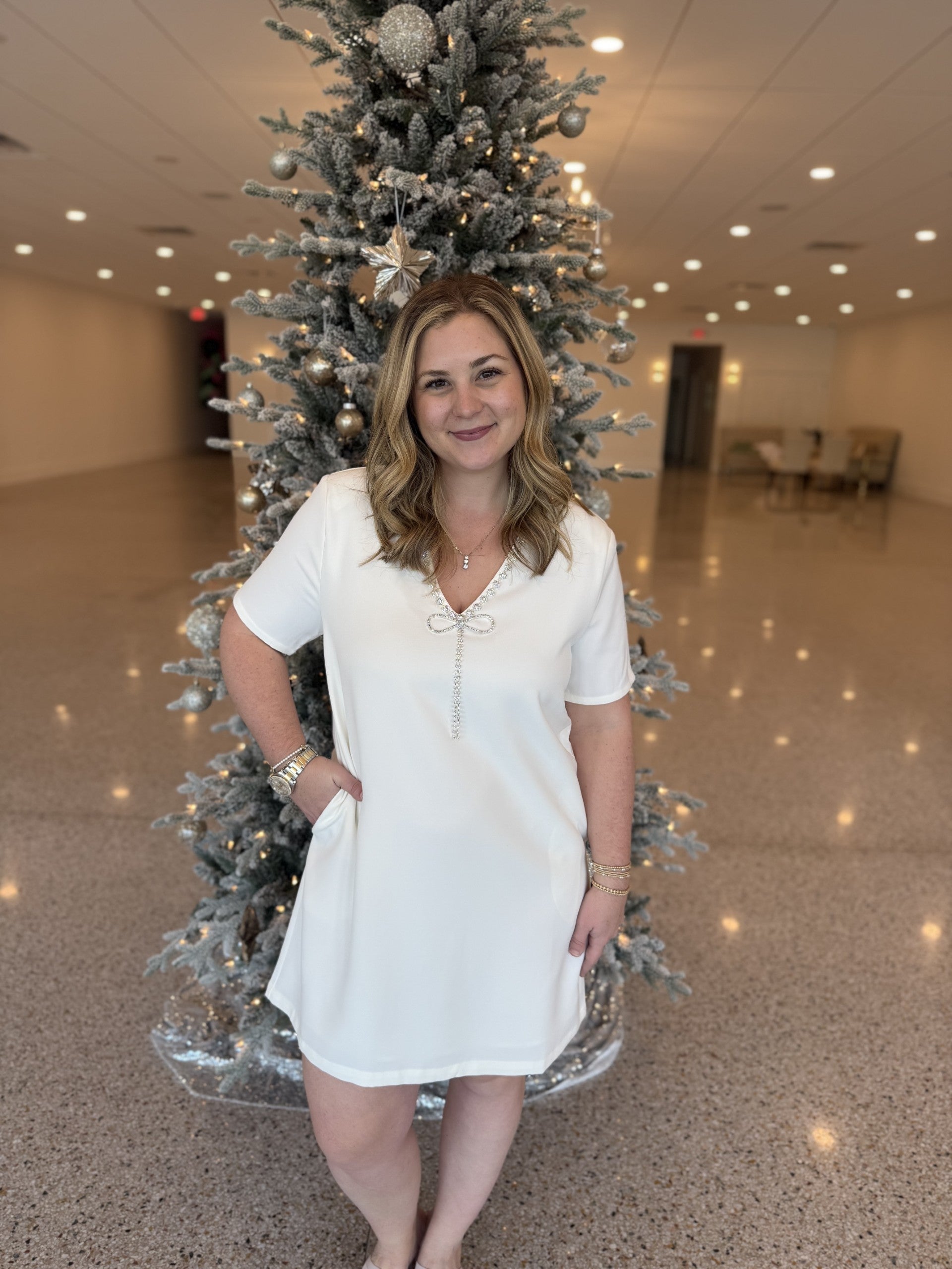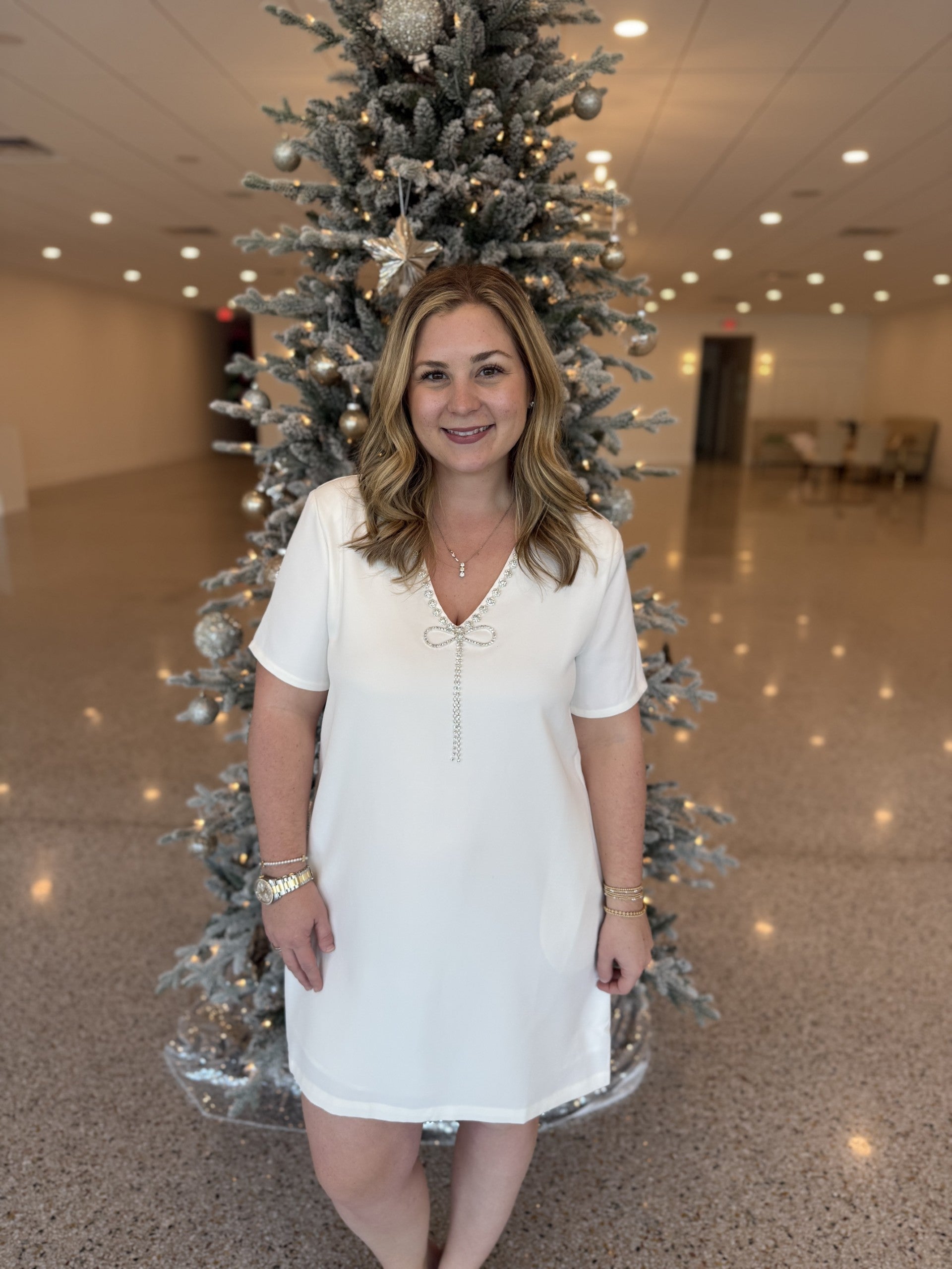 The Stazie V-Neck Shift Mini Dress will make you the feel star of the party. Shot sleeves frame a deep v-neckline with rhinestones on the border leading to a cute bow in the center. The bodice is shift with a perfect mini length to pair with heels.