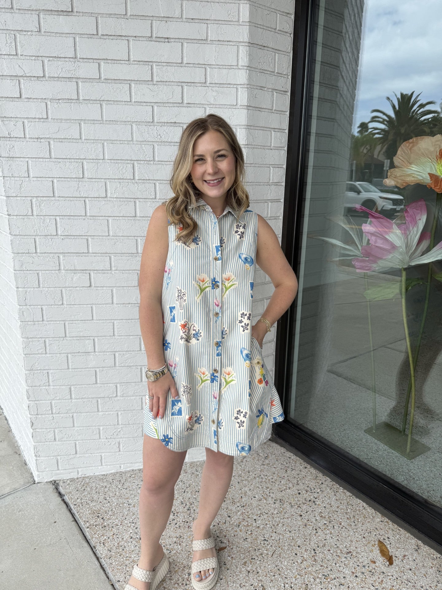 This breezy button-front dress features a flattering sleeveless silhouette with a relaxed, easy fit that moves with you. Designed with soft vertical stripes and delicate floral accents, it strikes the perfect balance between classic and playful. The collared neckline adds a polished touch, while the lightweight fabric keeps things cool and comfortable all day long.