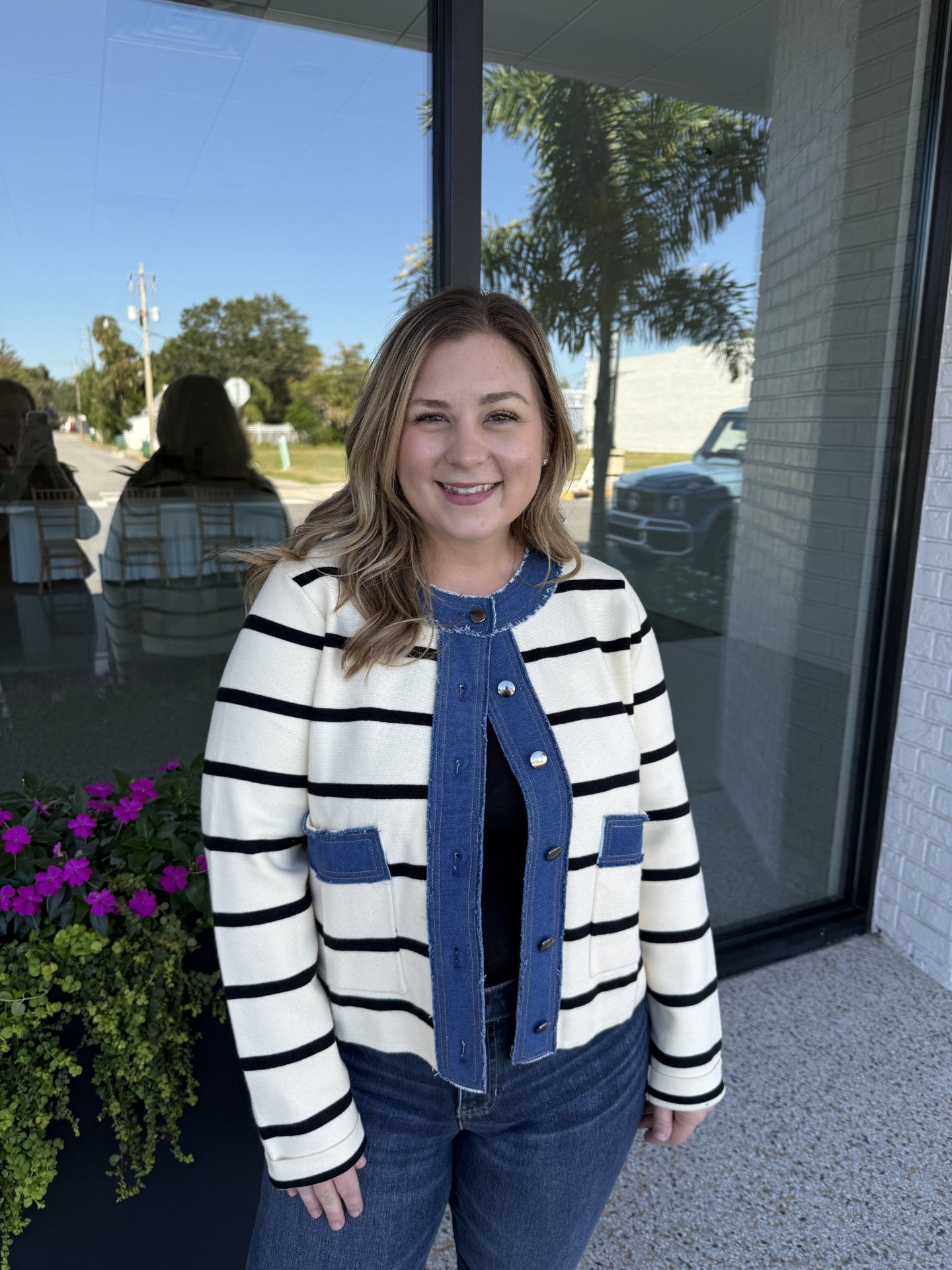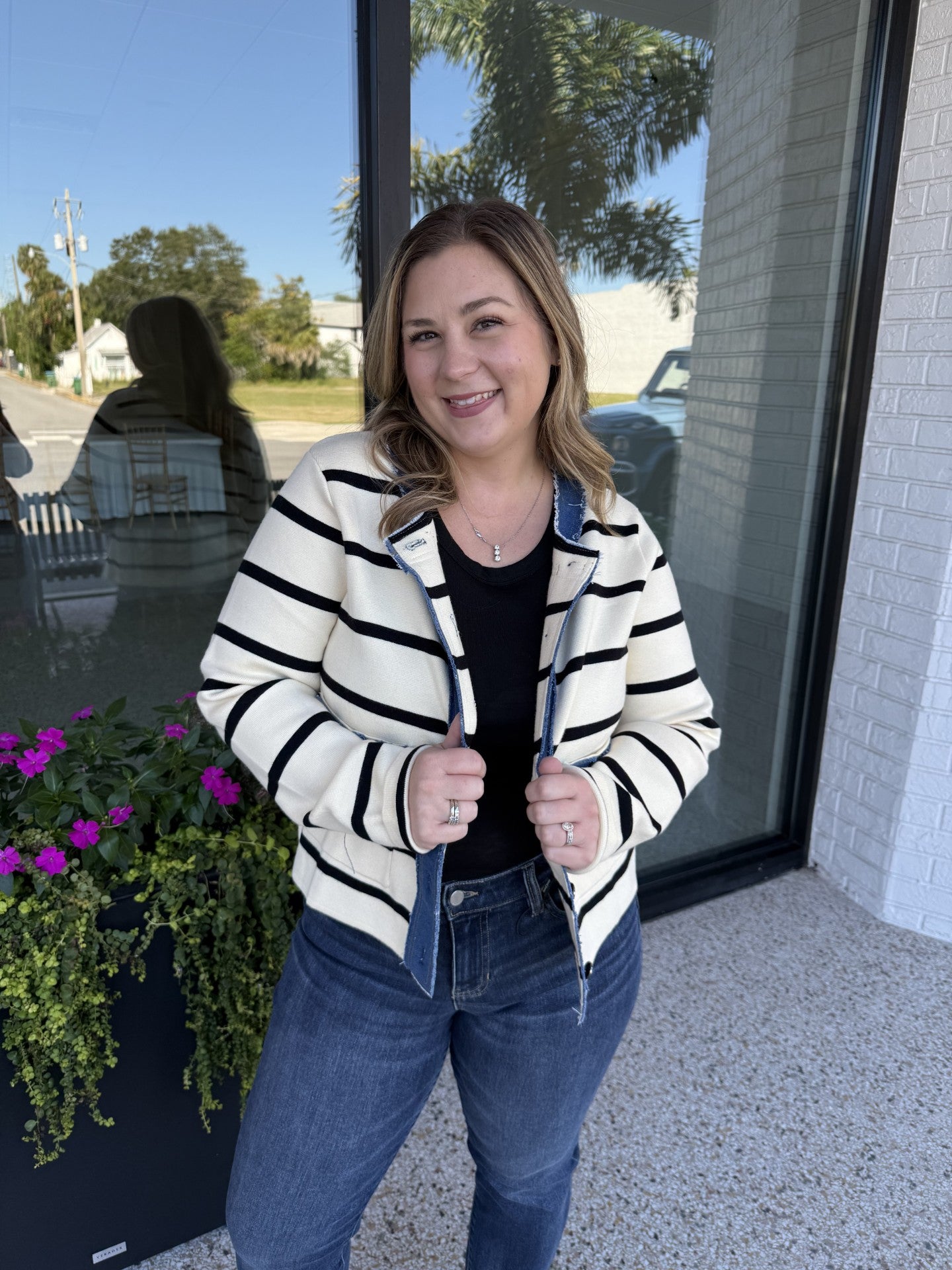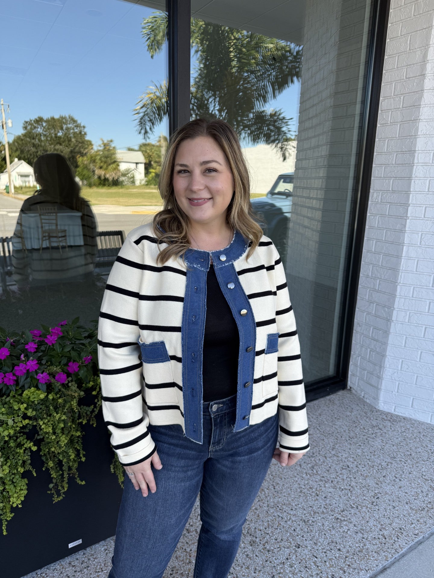 Elevate your fall wardrobe with the Janelle Jacket, a playful twist on a classic silhouette. This wide cream and black striped jacket features cool contrasting denim accents for a style that feels fresh and versatile—two looks in one! Its round, collarless neckline keeps things effortlessly chic, perfect for your next autumn adventure. Cozy, stylish, and ready to turn heads wherever you go.