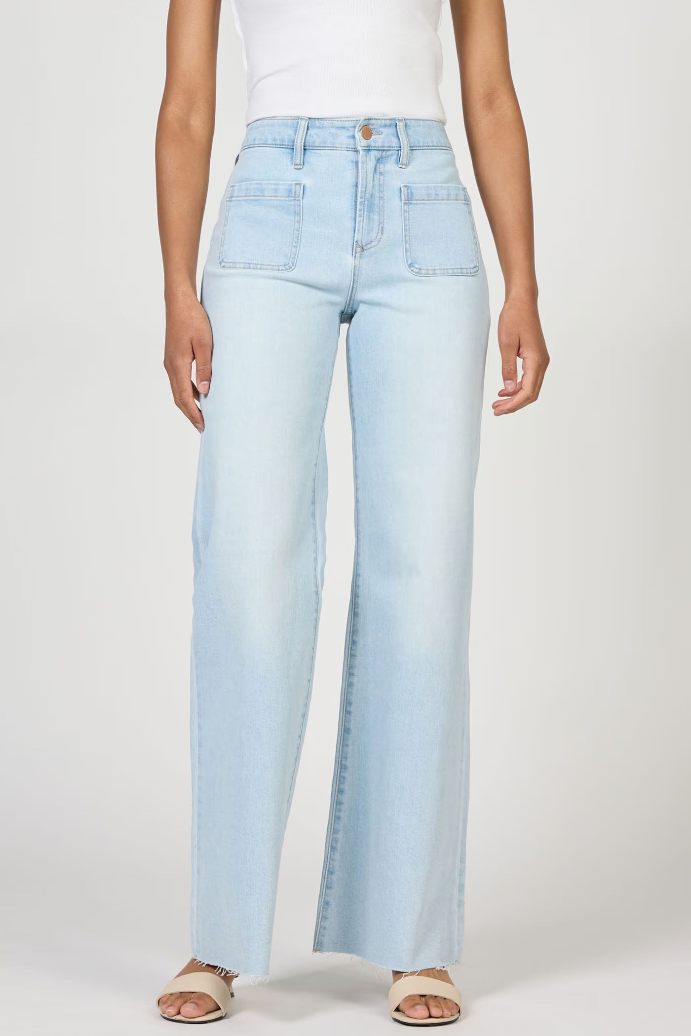 These mid rise wide leg jeans in a misty cloud hue offer a stylish twist with their raw hem, providing a relaxed and modern look.